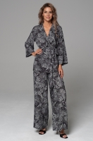 -брюки‑палаццо — широкая модель с плавными линиями, добавляющая образу лёгкости и грации. Изготовлены из той же принтованной вискозы, что обеспечивает единство ансамбля.