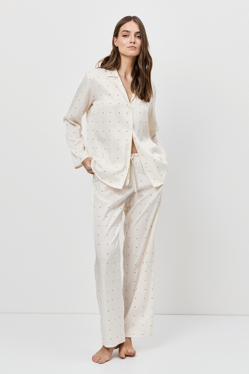 Этот шелковистый и изысканный пижамный комплект светло-бежевого цвета подарит вам непринужденную элегантность дома или во время сна.