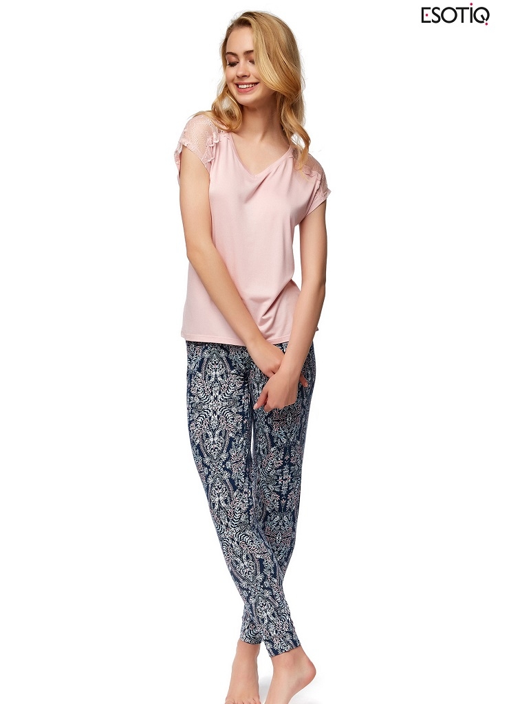 Пижама женская 37384 NIXON от европейского производителя Esotiq. Футболка с широким вырезом, на плечах декорирована кружевом. Укороченные штаны зауженного кроя.
