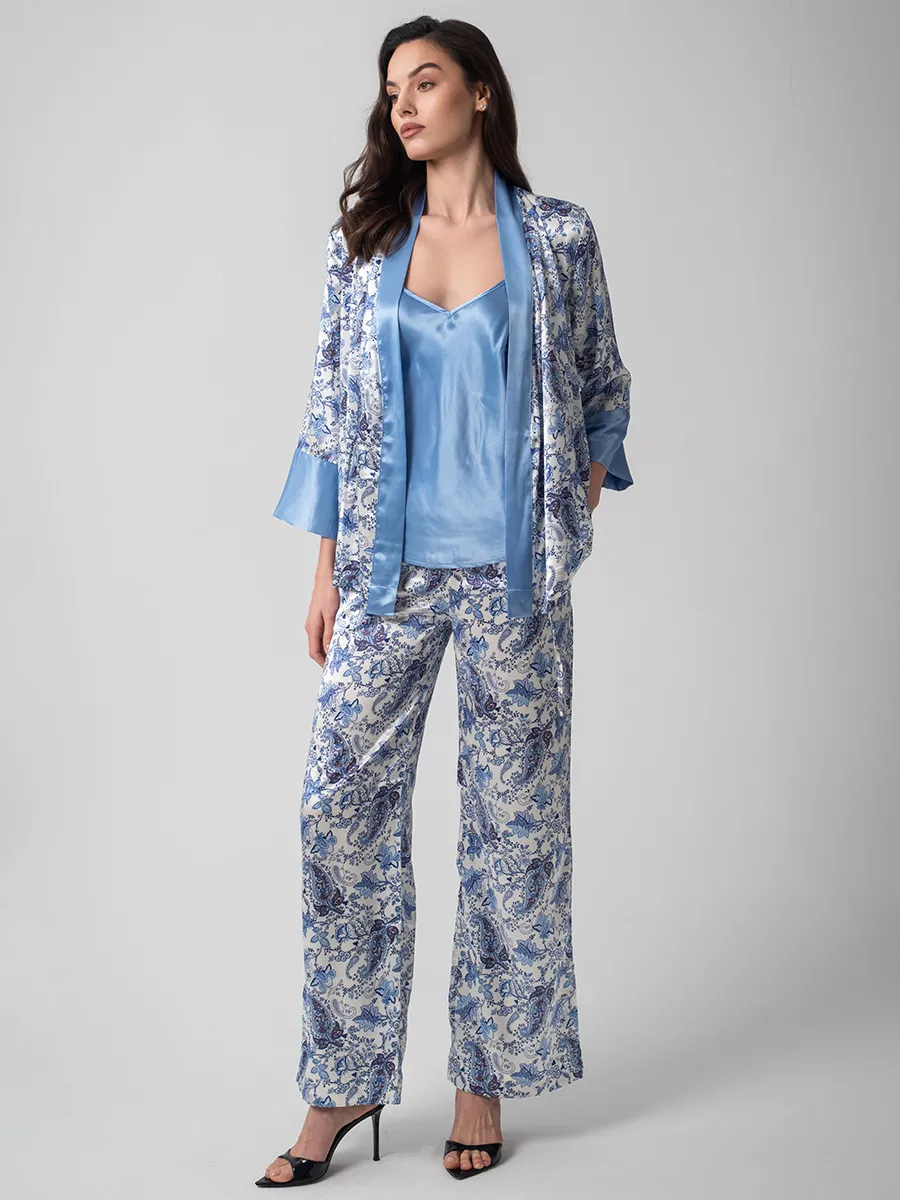 Тип Пижама с брюками Цвет Голубой Модель Комплект жакет, топ, брюки Материал Смесовый шёлк