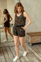 Короткий комбинезон Миа-Миа полуприлегающего силуэта с эффектом топа и шорт, выполнен из клетчатой вискозы. Комбинезон отрезной по линии талии, с кулиской на резинке. Верхняя часть с овальным вырезом горловины. Верх застегивается на пуговицы. Имеются боковые карманы.