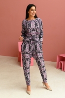 Комбинезон брючный, приталенный с карманами, из принтованой вискозы. Крой рукава летучая мышь, заужены к запястью. Вырез горловины, лодочка, по полочке, на спинке V-образный вырез регулируется с помощью шнура-завязки. Верхняя и нижняя часть соединённые по линии талии. Брюки с заниженным средним швом, свободные. Брючины заужены. Пояс-кулиска на эластичной тесьме.