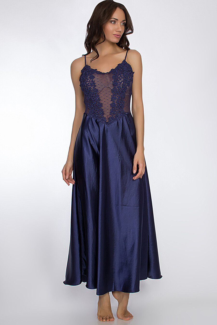 Изящная длинная ночная сорочка полуприлегающего силуэта с полукруглым вырезом горловины на полочке из искусственного шелка с трикотажной полупрозрачной сеткой и кружевом.Тонкие регулируемые бретели из однотонного шелка придают изысканность модели. Верхняя часть сорочки выполнена из трикотажной полупрозрачной сетки, которая великолепно сочетается с изысканностью объемного кружева, которым декорированы: верхняя часть лифа полочки, центральные наклонные линии по грудии, v-образная отрезная линия талии на полочке. Нижняя часть полочки и нижняя часть спинки со средним швом выполнены из однотонного искусственного шелка. На спинке по верхнему краю лифа расположена резинка для прилегания.Пояс в боковых швах по линии талии на спинке придает законченный образ модели.