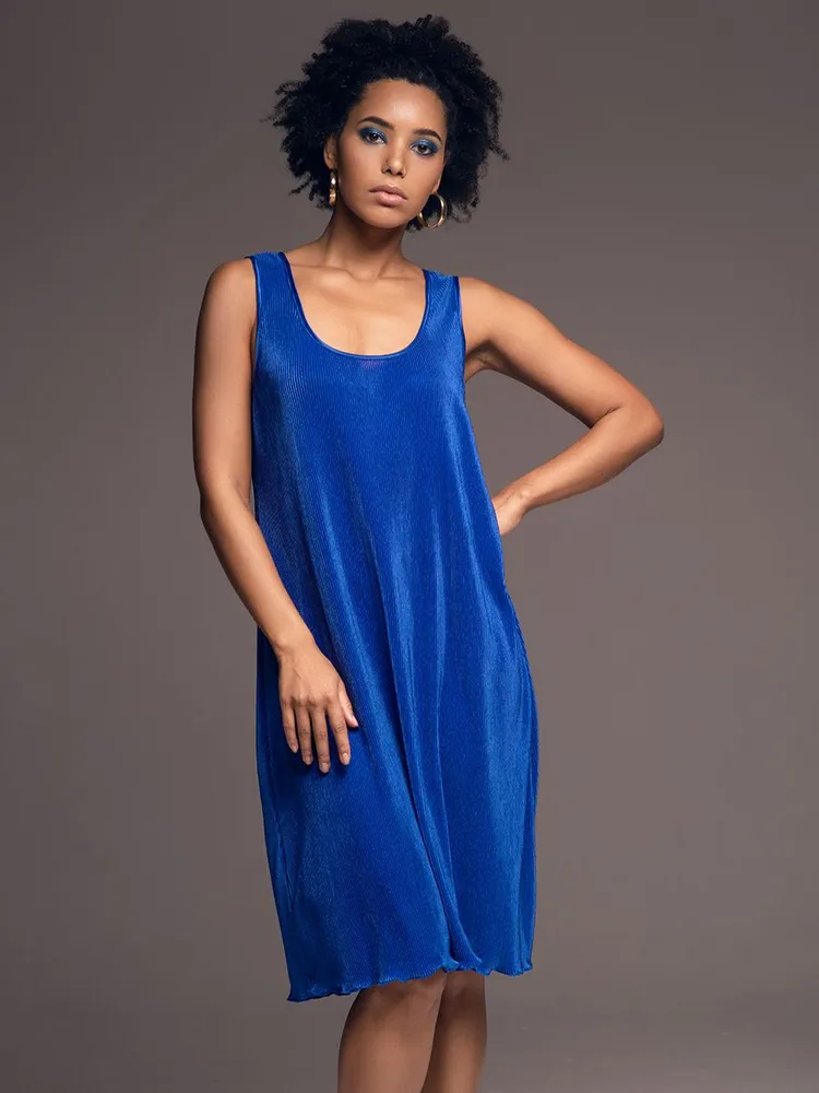 Элегантное платье-сорочка синее плиссе на широкой бретели Рокси 7371 Mia-Amore имеется в размерах: S. M. L. XL. XXL. 3XL.