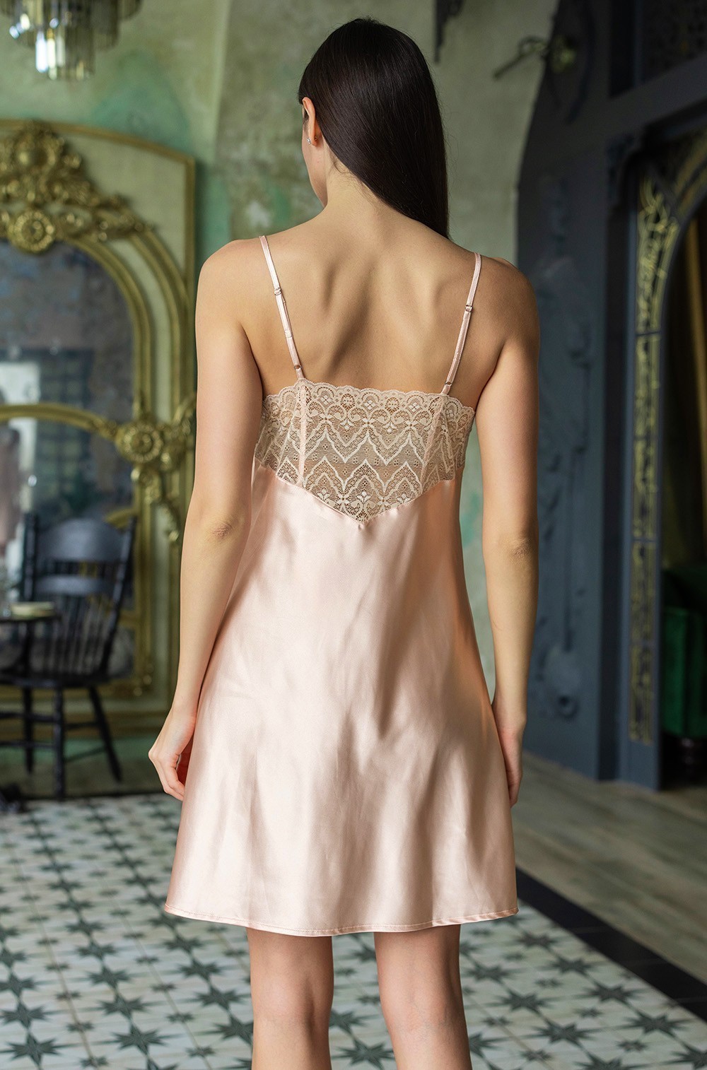 Тип Сорочка короткая Цвет Бежевый Модель Сорочка на узкой лямке Материал Полиэстер