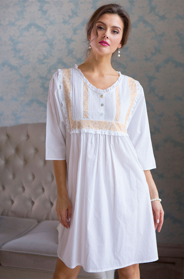 • Хлопковая рубашка Миа-Миа средней длины с широким рукавом 3/4 и декором в виде вышивки по лифу. Горловина декорирована узкой рюшей. На полочке расположена застежка-планка на перламутровых пуговицах. По лифу расположены вертикальные отсроченные защипы и ленты с вышивкой. По боковым швам и талии лиф оформлен узкой рюшей. Юбка рубашки на защипах по уровню талии. Удобная и практичная сорочка для беременных и кормящих женщин.