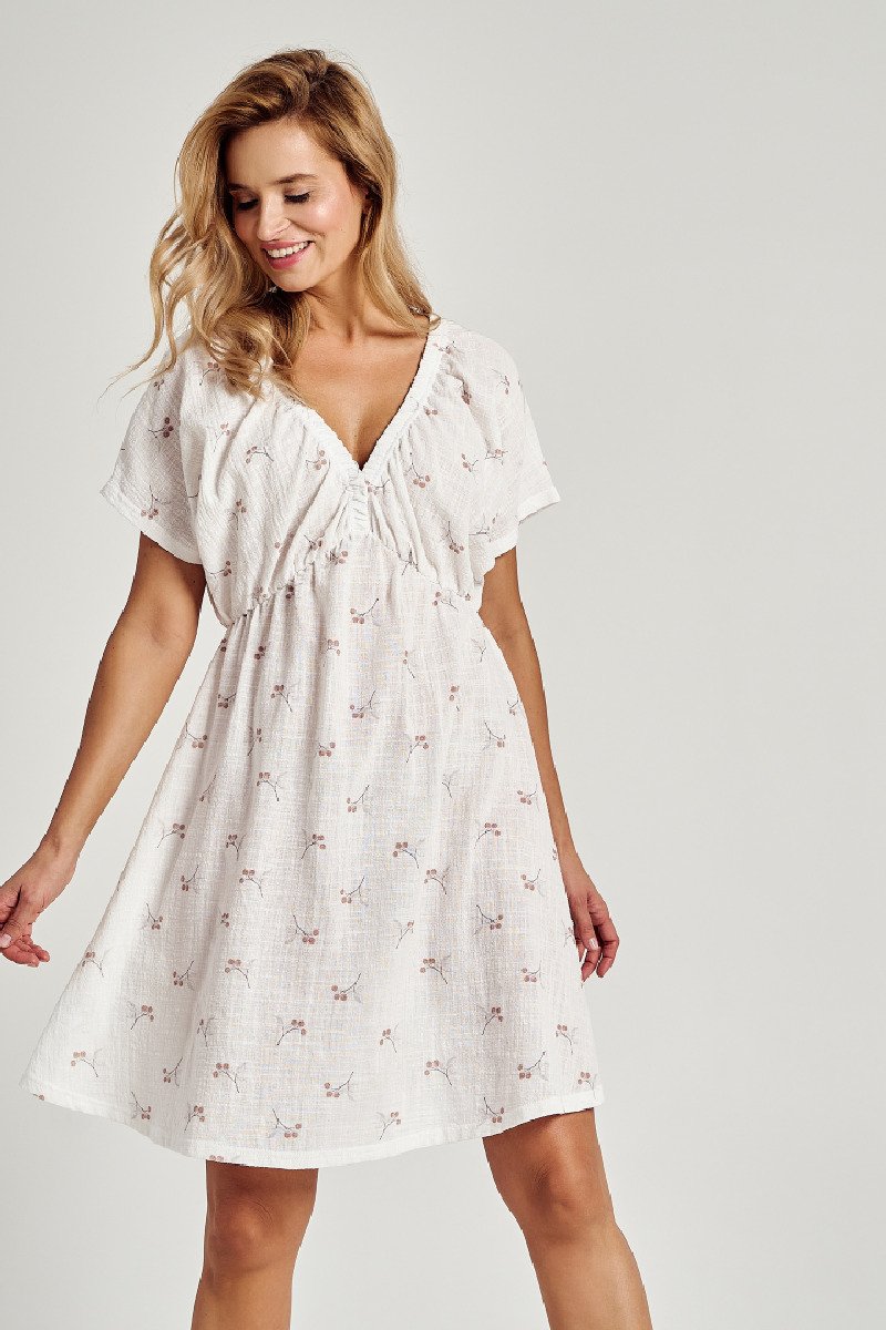 • Хлопковая женская сорочка из хлопка Kiara. Изготовлена из высококачественного хлопка белого цвета с цветочным принтом. Сорочка с V-образным вырезом с коротким рукавом, длина выше колена. Выглядит очень женственно и элегантно.