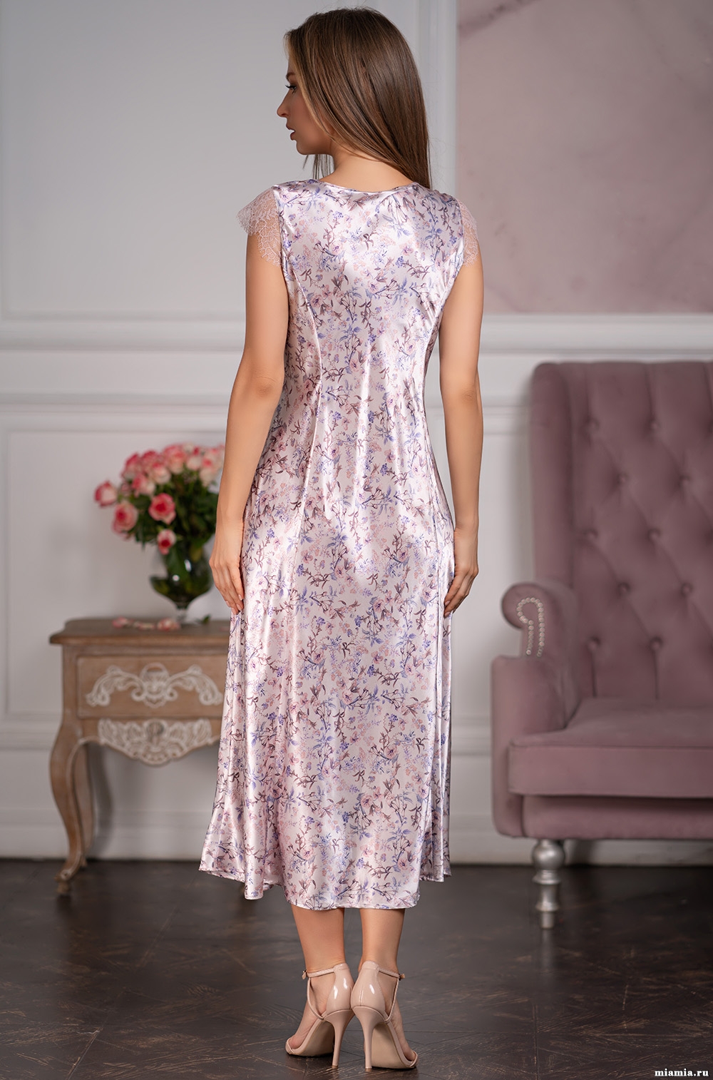 Длинная сорочка Mia-Amore с рельефами декорирована кружевом по вырезу горловины и выполнена из нежного смесового шелка с цветочным принтом. Рукава-крылышки сорочки выполнены из кружева. Лиф украшен по центру изящной подвеской.
