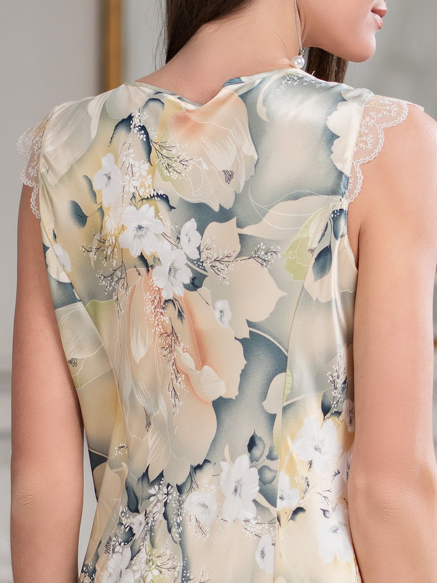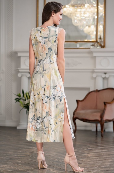 Длинная сорочка Mia-Amore с рельефами выполнена из принтованного смесового шелкового полотна. Вырез горловины спереди и плечи сорочки украшает отделка из вышивного кружева. По центру лифа расположен декоративный бантик.