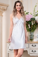 Романтичная короткая сорочка Mia-Amore с отрезными чашками и на тонких бретелях, выполнена из смесового однотонного шелка. Кружевные вставки украшают вырез полочки и спинки, а также боковые части сорочки. Декор - атласный бантик с искрящейся подвеской, расположенный по центру выреза сорочки.