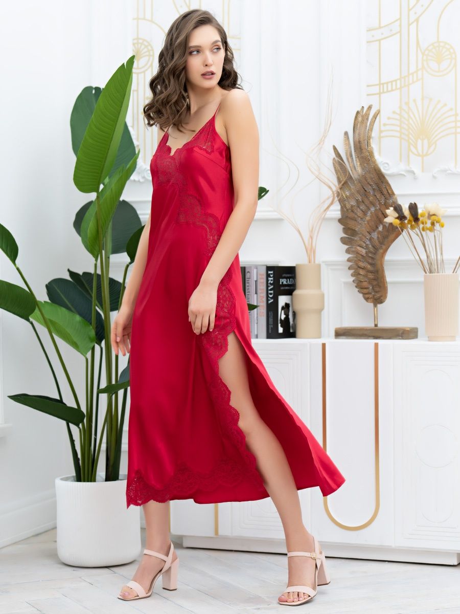 Шёлковая элегантная сорочка длинная с кружевом красная Аурелия 3898 Mia-Amore имеется в размерах: S. M. L.