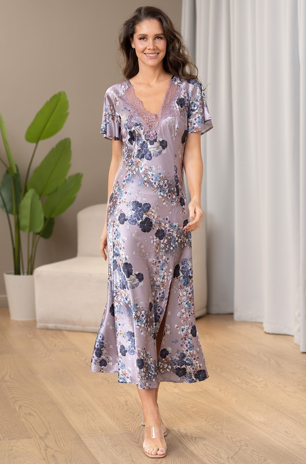 PRIMROSE Примроуз 4064- PRIMROSE 4064 - это длинная сорочка с вертикальными складками и короткими рукавами, изготовленная из однотонного смесового шелка. Эта модель идеально подходит для комфортного домашнего отдыха. По низу изделия расположен эффектный разрез, а горловина украшена нежным розовым кружевом.