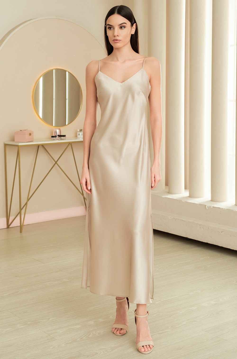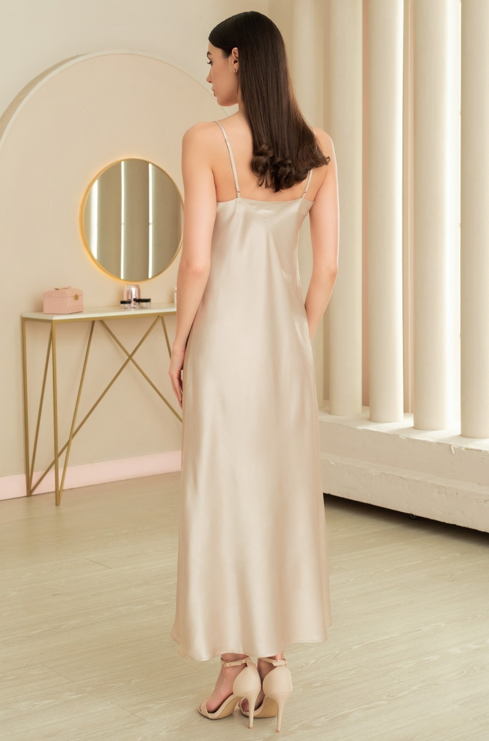 Тип Сорочка длинная Цвет Бежевый Модель Сорочка на узкой лямке Материал Смесовый шёлк