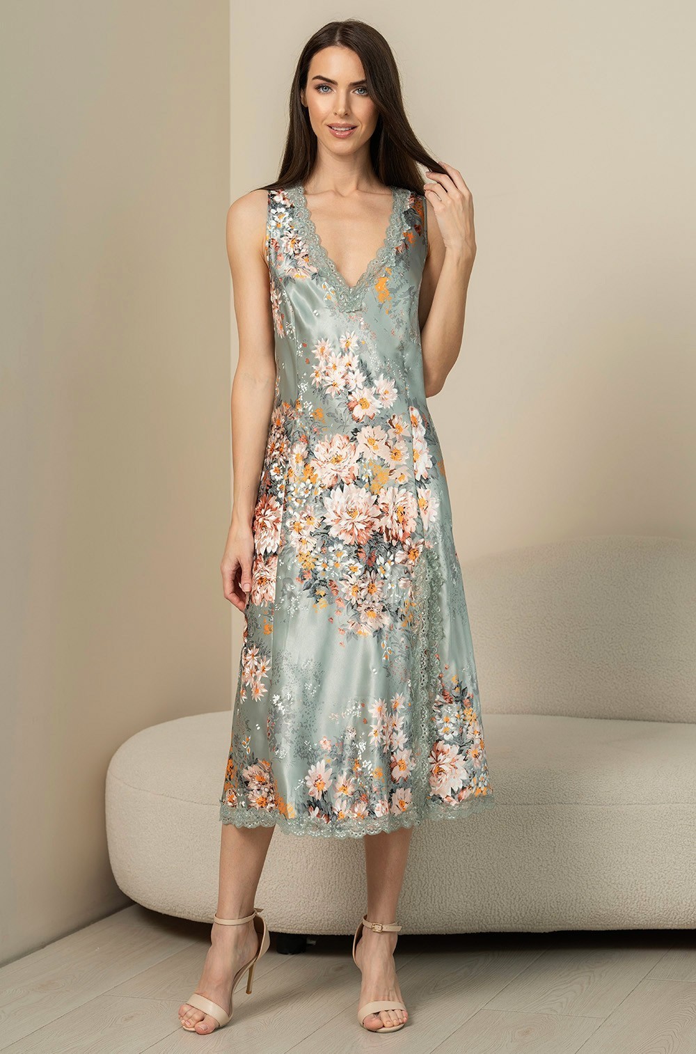 Сорочка изготовлена из нежного шёлка с удивительным и оригинальным цветочным принтом. Она также украшена изумительным тонким кружевом, что делает её желанным приобретением. Сорочка способна разбудить чувственность, подчеркнуть женственность и добавить элемент дерзости и игривости.