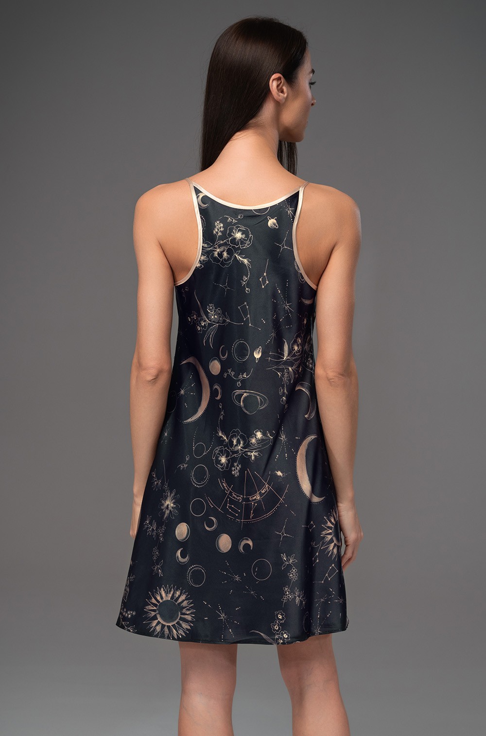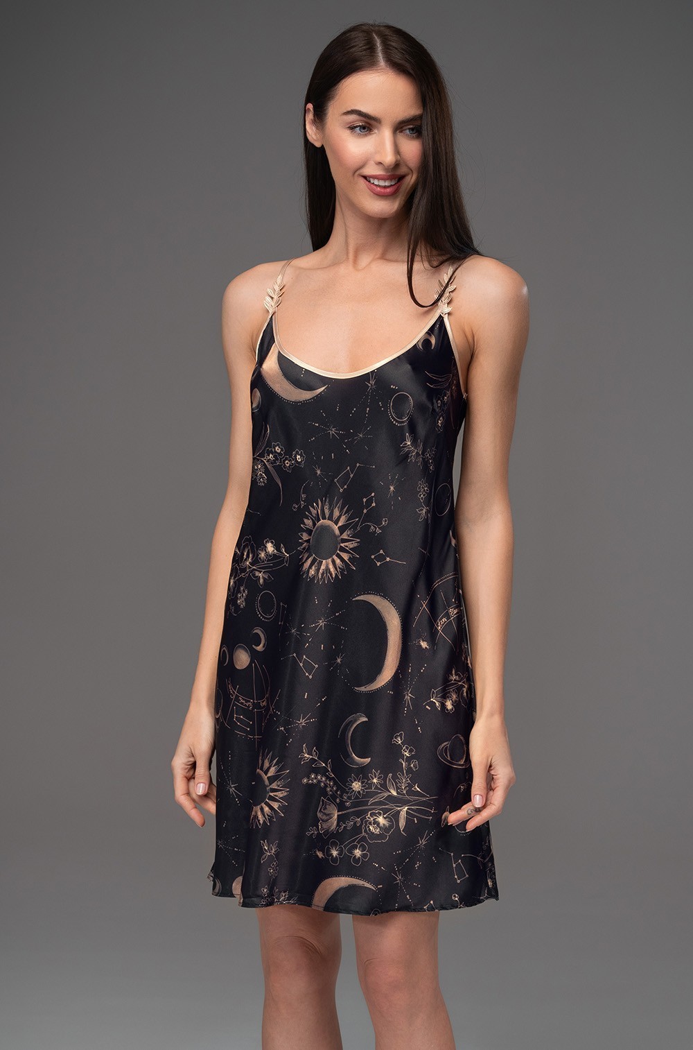 Galateya 4461. Короткая сорочка Mia-Amore без подреза на тонких контрастных бретелях выполнена из принтованного смесового шёлка. Бретели сорочки украшены кружевным декором в виде веточек, что придает изделию изысканность и утонченность. На спинке расположен оригинальный вырез, добавляющий уникальности и шарма.