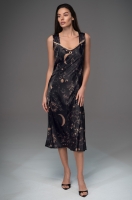 Galateya 4468. Длинная сорочка Mia-Amore на широких бретелях выполнена из принтованного смесового шёлка. Этот роскошный наряд создаёт женственный и элегантный образ, который идеально подойдёт для любого времени суток. Силуэт сорочки, расклешённый к низу, формируется за счёт вертикальных рельефов, что придаёт ей изысканность и утончённость. Вырез лифа сорочки декорирован тонким золотым кружевом и декоративным бантиком, добавляющими изделию нотку гламура и шарма. Сбоку сорочки расположен изящный разрез, придающий ей дополнительную легкость и соблазнительность.