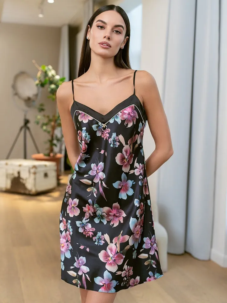 Элегантная сорочка Alicia Mia-Amore. Изысканная модель для особенных моментов. Роскошная сорочка Alicia от Mia-Amore — воплощение утончённого стиля и комфорта. Изящная модель на тонких бретелях привлекает внимание своим элегантным дизайном и премиальными материалами. Особый шарм изделию придаёт изысканный принт на смесовом шёлке, который гармонично сочетается с однотонной отделкой. Контрастный кант по краям создаёт утончённый акцент, подчёркивая безупречный крой модели.