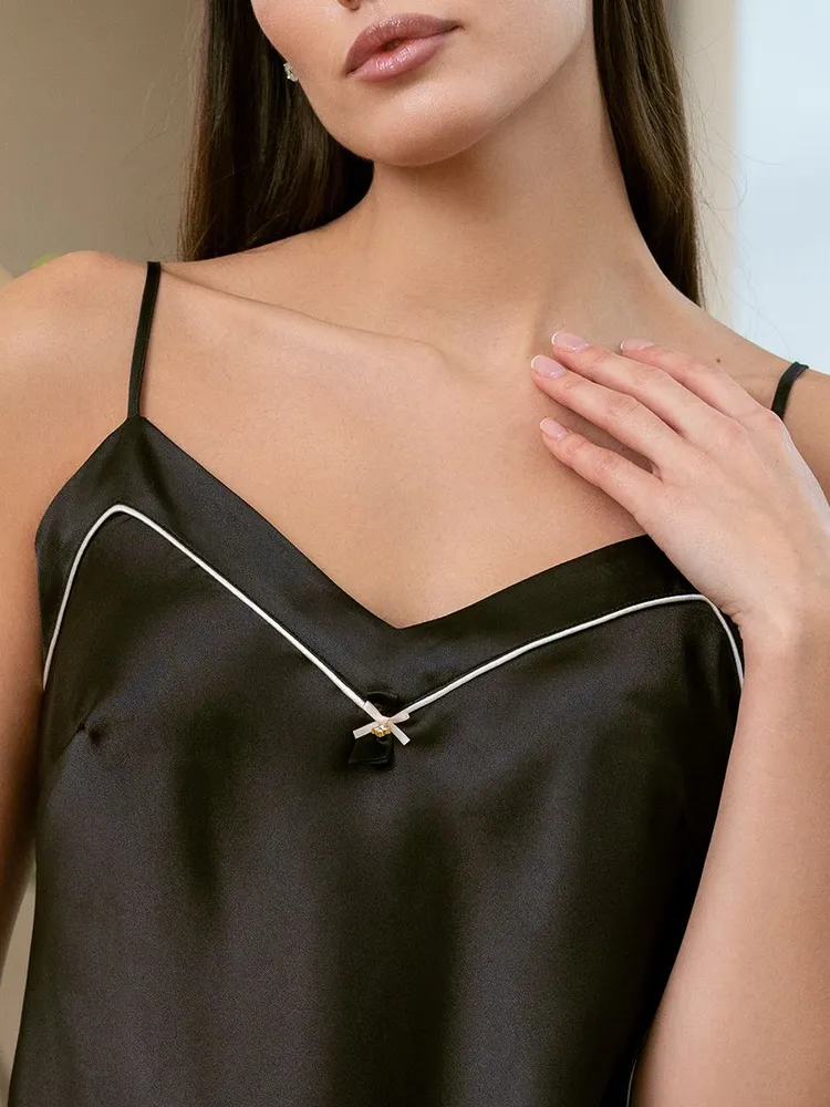 Особую утонченность модели придает элегантный декор: атласный бантик с изящной подвеской, расположенный по центру выреза сорочки. Этот деликатный акцент добавляет образу женственности и шарма.