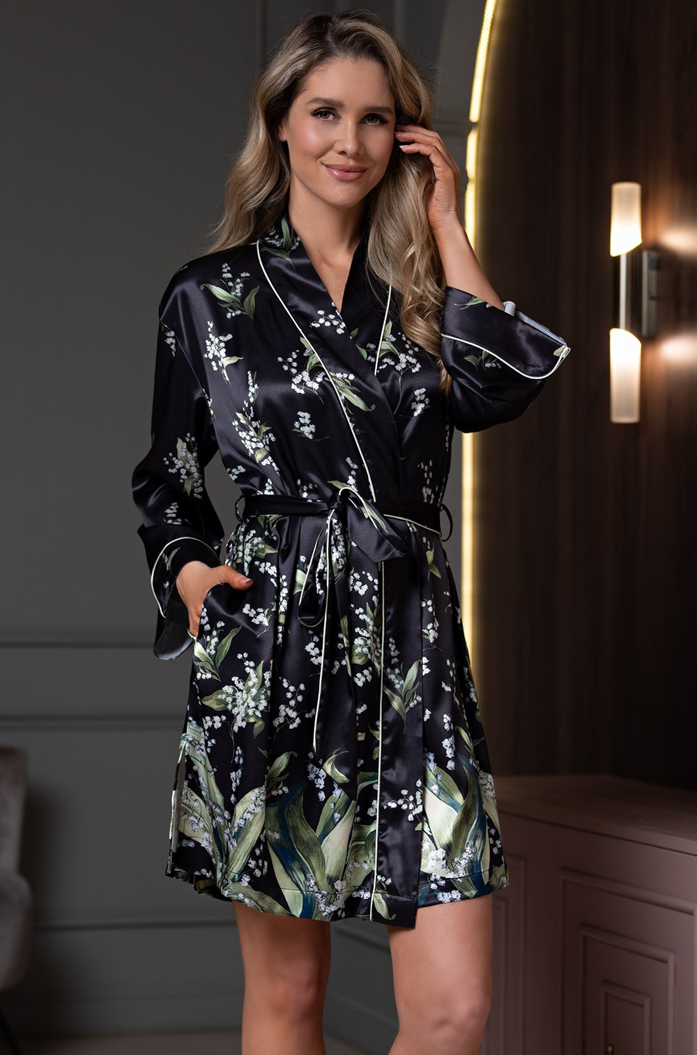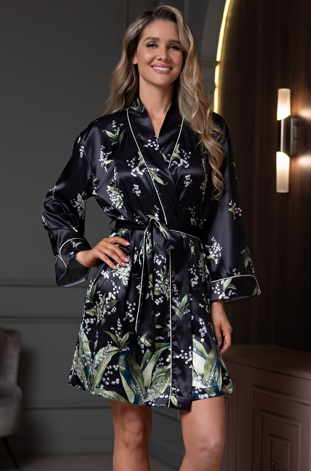 Шёлковый халат короткий на запахе Лурдес 4553 Миа-Аморе представлен в различных размерах для максимального комфорта: