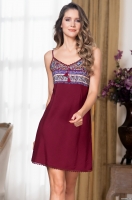 Короткая сорочка Mia-Amore на тонких бретелях, выполнена из однотонной вискозы с орнаментальной вставкой в верхней части полочки и спинки. Вырез и низ сорочки обработан узким кружевом. Бантик с кисточками украшает вырез.