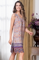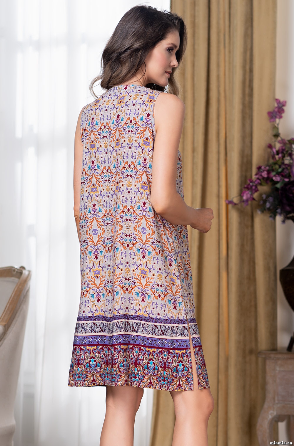 Удлиненная сорочка Mia-Amore свободного силуэта на широких бретелях, выполнена из вискозы с купонным принтом. Вырез обработан планками с застежкой на пуговицы. По бокам расположены разрезы.