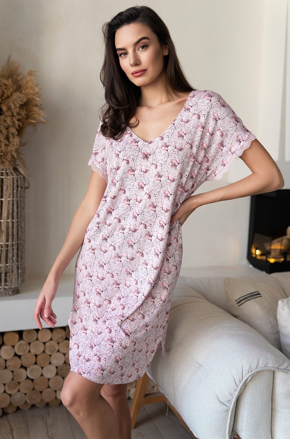 Ночная сорочка женская Inessa Mia-Amore свободного силуэта Mia-Amore средней длины с коротким рукавом. Изделие выполнено из принтованного трикотажного полотна с кружевной отделкой по низу рукавов. Центр выреза украшен атласным бантиком. Удлинённое плечико сорочки и свободный крой подойдут любому типу фигуры. По низу рукава оформлены кружевом. Широкий размерный ряд от S (44) до 4XL(58) позволяет выбрать модель на любую фигуру: полную и стройную, а также на любой рост. Сорочка из вискозы с цветочным принтом позволит Вам выглядеть волнующе каждое мгновение: за утренней чашкой кофе, выйдя из душа. На модели сорочка 46-ого размера.