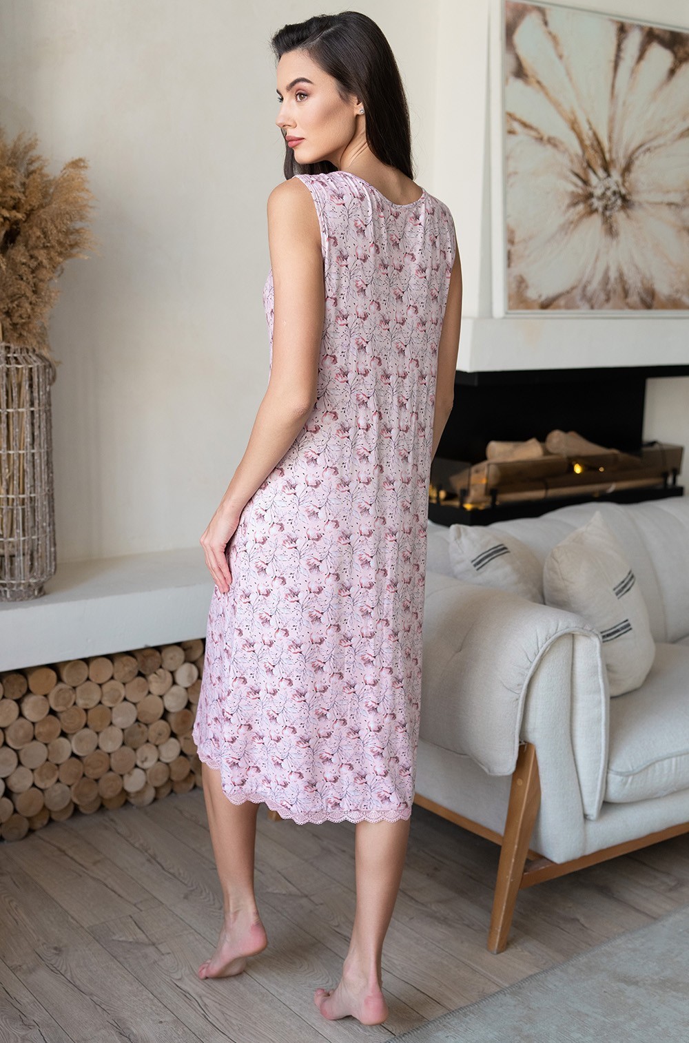 Ночная сорочка женская Inessa Mia-Amore свободного силуэта Mia-Amore Сорочка Mia-Amore средней длины на широких бретелях без подреза под грудью, выполнена из принтованного трикотажного полотна с кружевной отделкой по низу изделия. Центр выреза украшен атласным бантиком. Маечный тип сорочки и свободный крой подойдут любому типу фигуры. Широкий размерный ряд от S (44) до 4XL(58) позволяет выбрать модель на любую фигуру: полную и стройную, а также на любой рост. Сорочка из вискозы с цветочным принтом позволит Вам выглядеть волнующе каждое мгновение: за утренней чашкой кофе, выйдя из душа. На модели сорочка 46-ого размера.