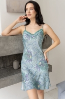 Короткая сорочка Mia-Amore на тонких бретелях, без подреза под грудью. Изделие выполнено из принтованной тканой вискозы. Верх сорочки обработан узким кружевом и кантом. По бокам расположены разрезы для свободы движения. Атласный бантик с подвеской украшает вырез сорочки.
