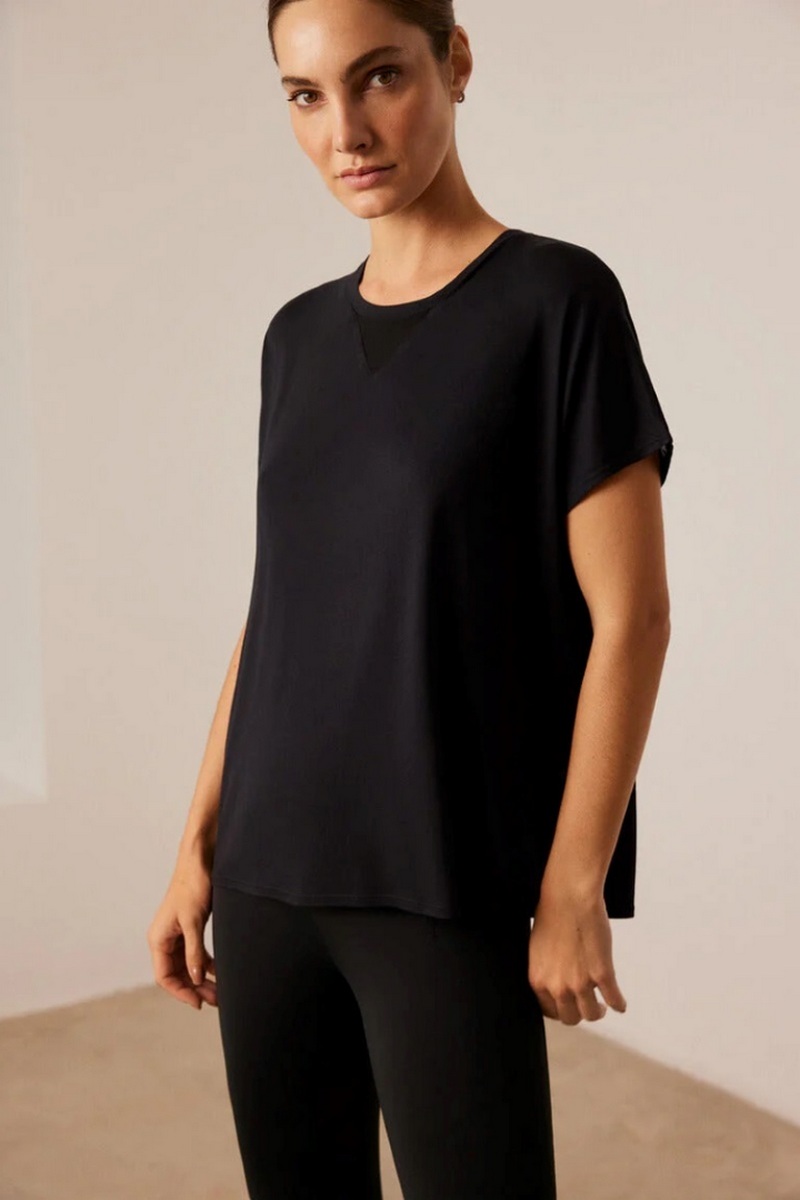 Спортивная футболка с короткими рукавами и прозрачной отделкой из тюля на шее и спине. Идеально сочетается с легинсами и спортивными топами.