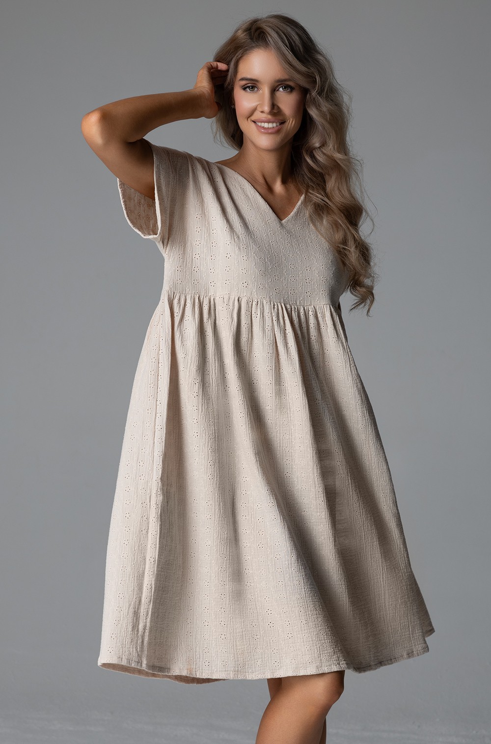 Лёгкое и элегантное платье‑туника из натуральной ткани — идеальный выбор для тёплых дней. Модель сочетает женственный силуэт, продуманные детали и непревзойдённый комфорт от Mia‑Amore.