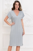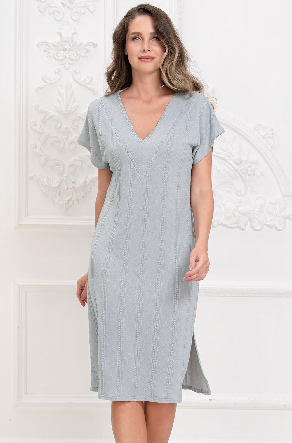 Туника женская домашняя с коротким рукавом до колен Mia-Amore выполнена из трикотажного полотна c фигурной вязкой. V-образный вырез изделия оформлен декоративной планкой. По низу изделия обработаны разрезы для большей свободы движения.