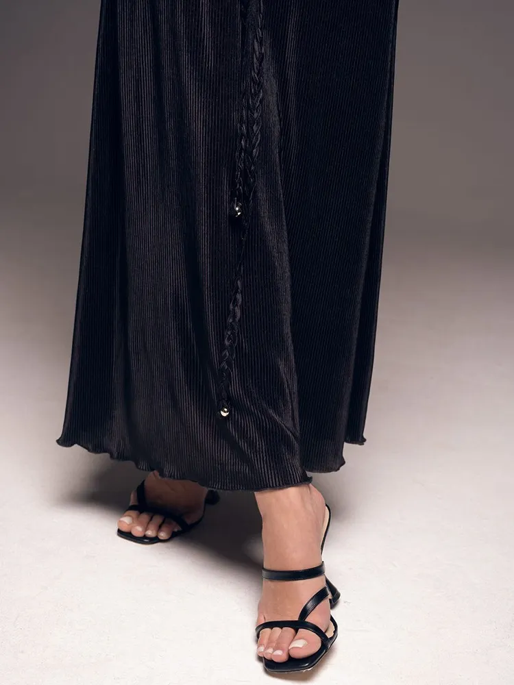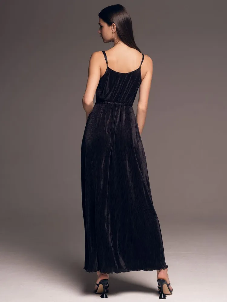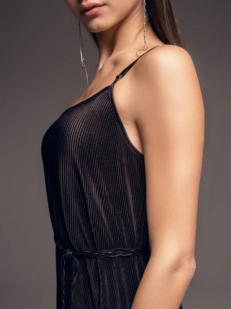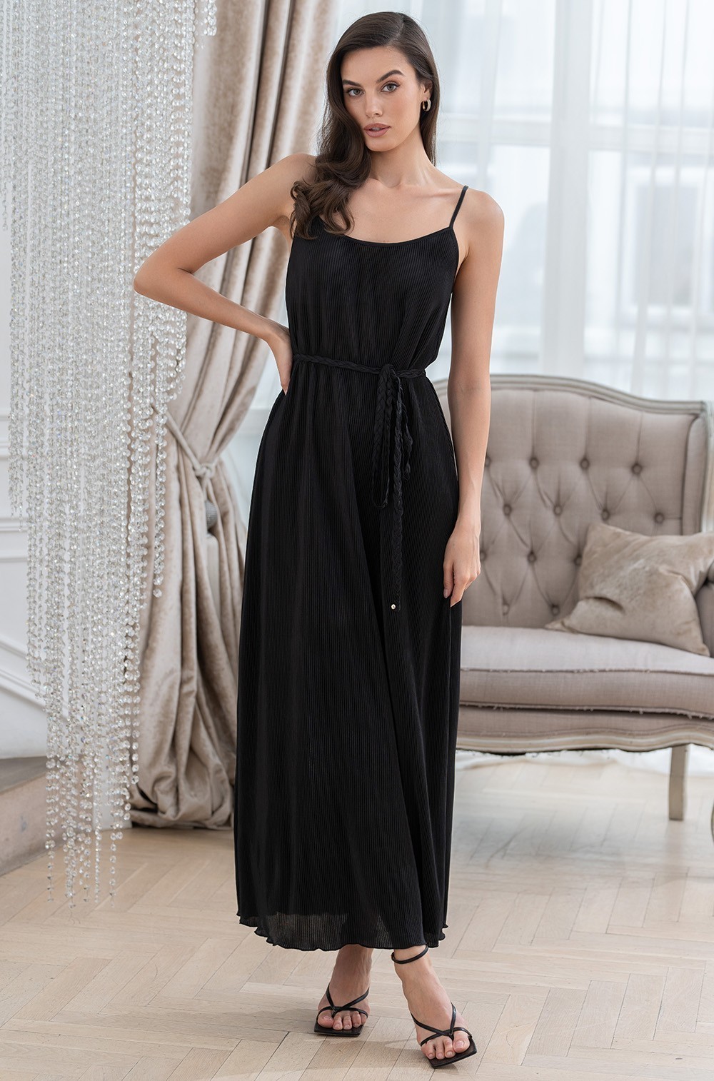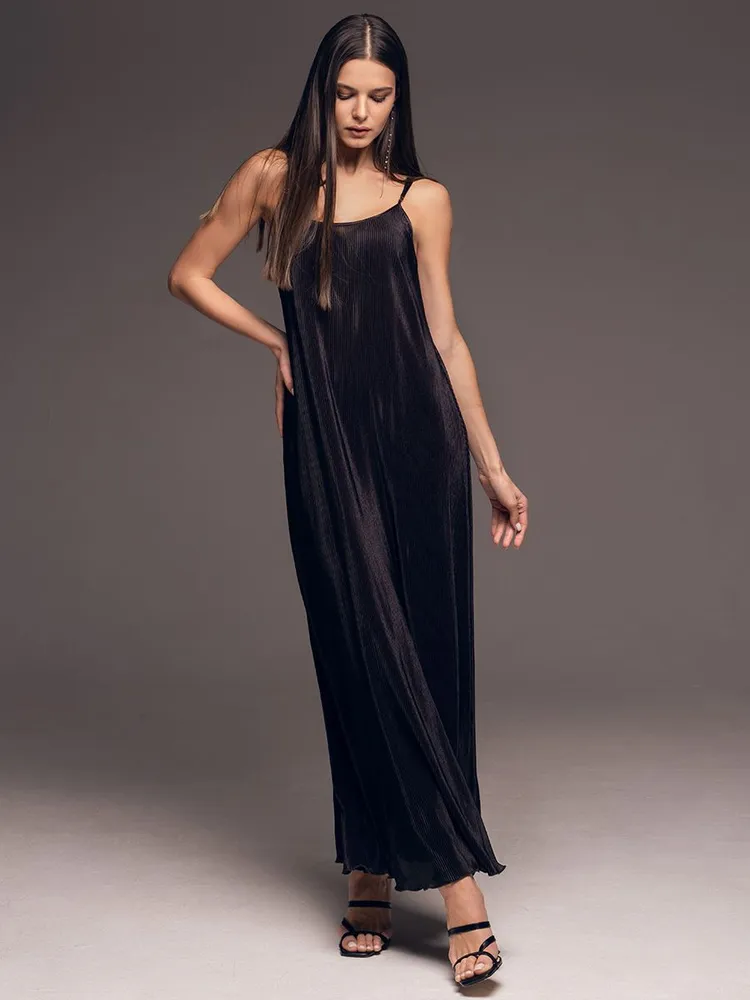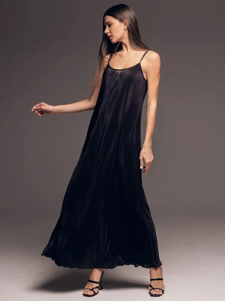 Длинное платье-сорочка плиссе чёрное на тонких бретелях Рокси 7378 Mia-Amore имеется в размерах: S. M. L. XL. XXL. 3XL.