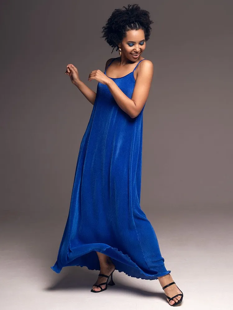 Длинное платье-сорочка плиссе синее на тонких бретелях Рокси 7378 Mia-Amore имеется в размерах: S. M. L. XL. XXL. 3XL.