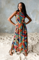 Длинное платье Миа-Миа прямого силуэта из яркой принтованной вискозы на поясе-шурке. Высота лифа регулируется с помощью шнура по горловине. Разрез по боковому шву.