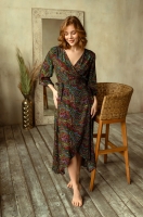 Платье домашнее женское Миа-Миа выполнено из яркой принтованной вискозы. Модель приталенного силуэта на запах длиной макси. Платье с V-образным вырезом горловины. Рукав свободного силуэта длиной 3/4.