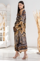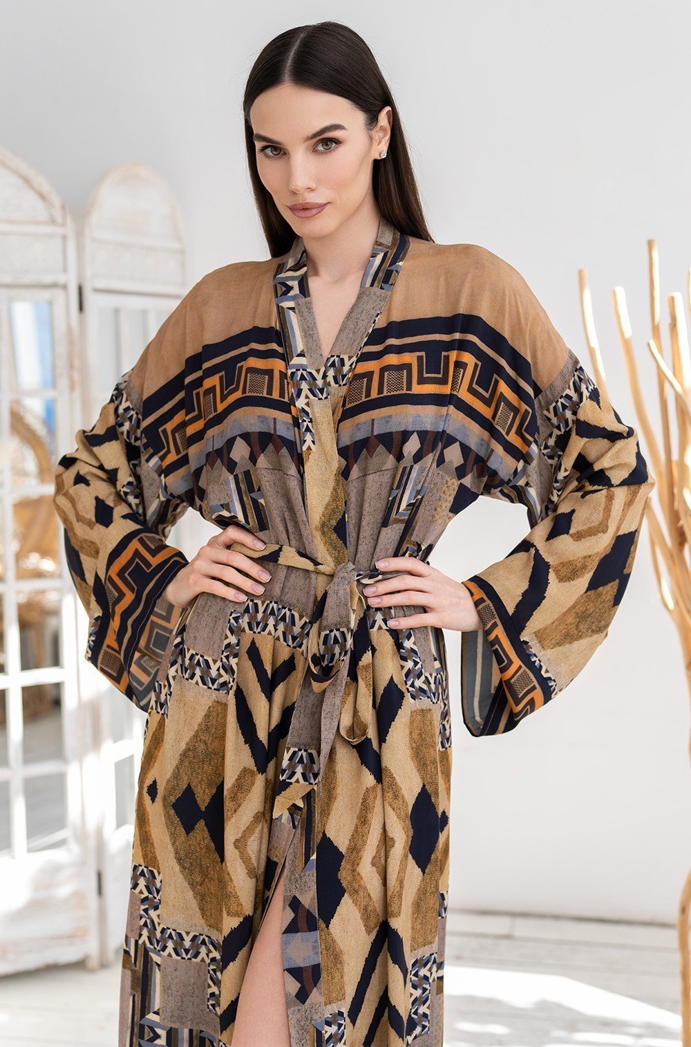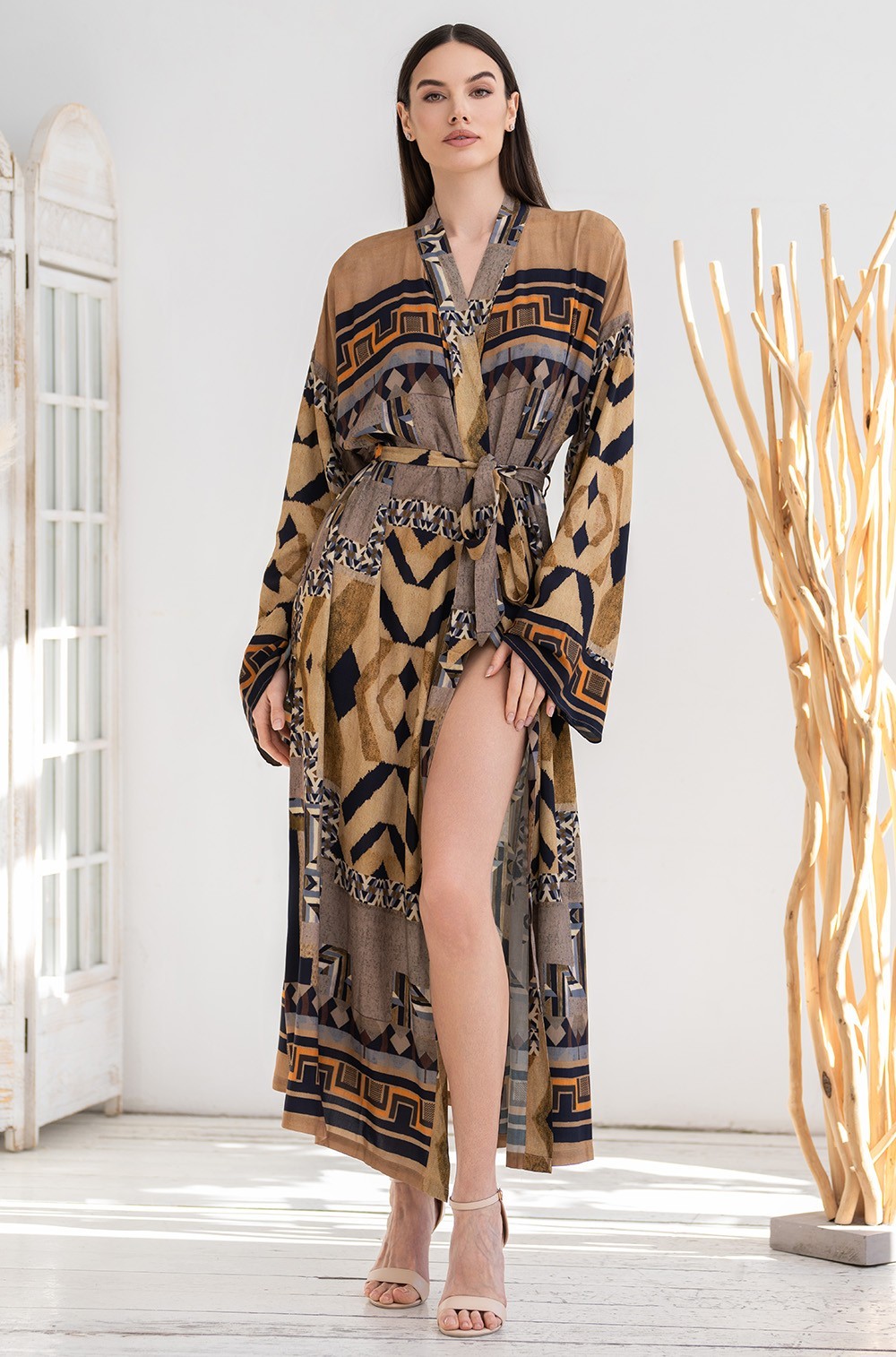 Элегантный длинный запашной халат с длинными рукавами, созданный для комфортного отдыха на пляже. Модель выполнена из высококачественной тканой вискозы с эффектным купонным принтом.