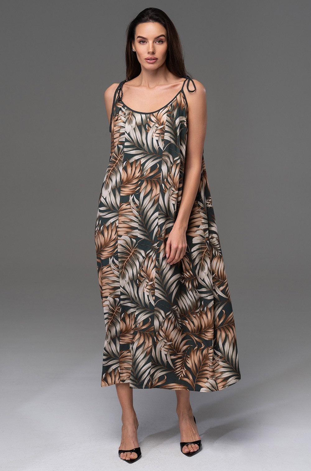 Эта роскошная модель, выполненная из 100% натуральной принтованной вискозы, создана для тех, кто ценит изысканность в каждой детали. Благородный материал нежно струится при движении, создавая изысканную драпировку.