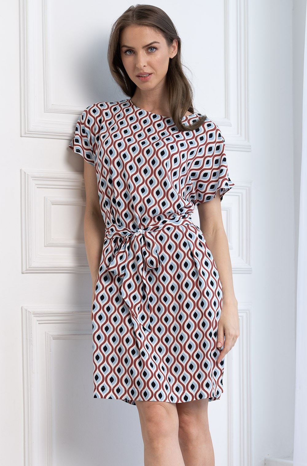 Удобная туника Mia-Amore до колен со спущенными плечами. По талии туника регулируется поясом. В боковых швах есть карманы. Туника выполнена из принтованного вискозного полотна.