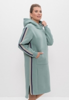 Стильное, уютное, женское платье из тёплого гладкокрашеного хлопкового трикотажа мягкой структуры средней плотности с начёсом на внутренней поверхности трикотажа. Отделкой служат манжеты платья, плотно облегающие запястья, из гладкокрашеного эластичного трикотажа с переплетением резинка. Вертикальные линии в комплекте подчёркнуты двойными параллельными бейками из трикотажа с атласной поверхностью по середине рукавов и в боковых швах платья. Свободное платье прямого силуэта с однослойным капюшоном, актуального свободного стиля оверсай. Вещь выглядит объемной и свободной. Низ переда платья короче спинки, в боковых швах разрезы для удобства в движении. На переде платья большой накладной карман-кенгуру. На карман приклеена фирменная стразовая термоаппликация Cleo.