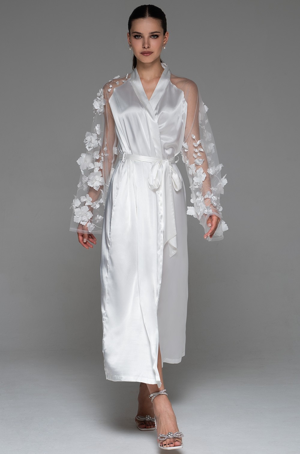 Особое внимание заслуживают эффектные расширяющиеся к низу рукава, выполненные из мягкой сетки с объёмными цветами. Они создают впечатление воздушности и невесомости, словно вы парите в облаке утончённости и изящества. Широкий атласный пояс, идущий в комплекте, не только фиксирует халат, но и служит стильным акцентом, подчёркивающим вашу талию и добавляющим образу завершённость.