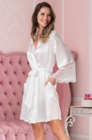 Элегантный короткий запашной халат Mia-Amore с длинными широкими рукавами,   выполнен из однотонного искусственного шелка с блеском и кружевными вставками, которые расположены по низу рукавов и верху спинки.  По бокам обработаны карманы.