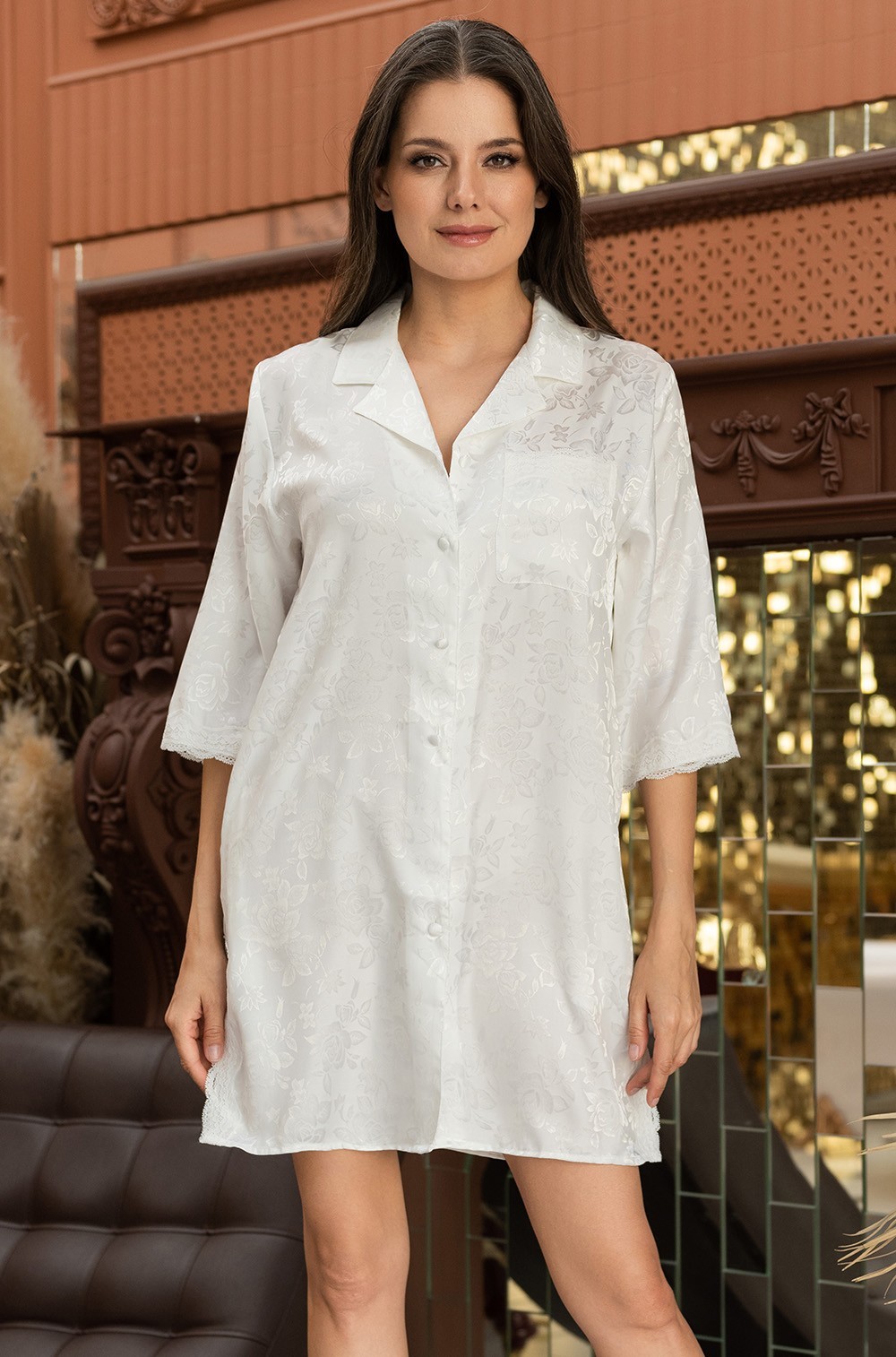 Рубашка на пуговицах Mia-Mella, свободного покроя с рукавом длиной 3/4 из искусственного шелка с жаккардовой основой. По бокам расположены разрезы. Низ рукавов, края разрезов и верх кармана обработаны ажурным кружевом. Ищите идеальную сорочку для сна и отдыха, либо на свадебное утро? Вам на помощь придет наша ночная сорочка женская шелковая! Рубашка женская на пуговицах- красивая, нежная, удобная и одновременно сексуальная, в ней Вы всегда будете чувствовать себя богиней.