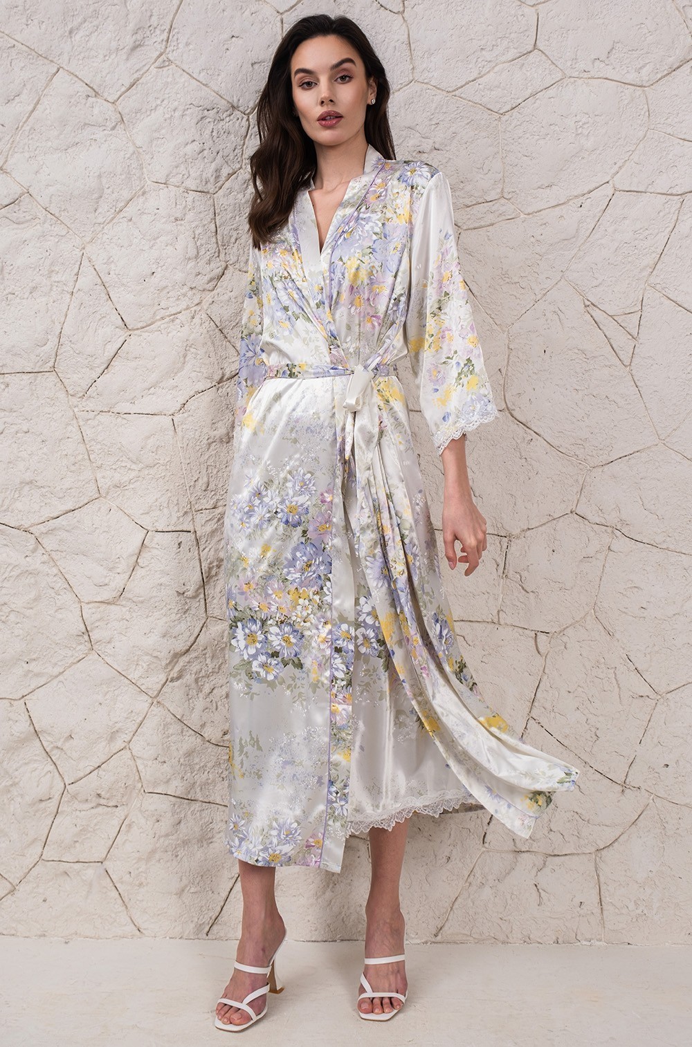 Тип Халат длинный Цвет Белый Модель Халат с рукавом 3/4 Материал Смесовый шёлк
