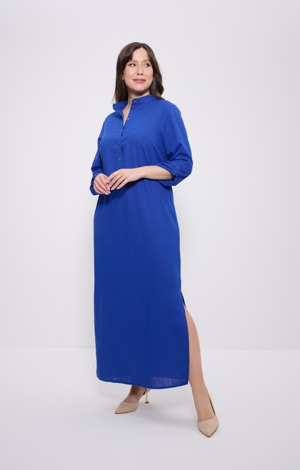Строгое, элегантное и удивительно удобное длинное платье из гладкокрашеной льняной ткани. Платье полуприлегающего силуэта, прямое, с нагрудными вытачками, с высокими разрезами в боковых швах по низу, с застёжкой на прорезную планку длиной до линии талии на петли и металлические пуговицы, с длинным рукавом, низ которого можно подвернуть и закрепить на аккуратную пату и пуговицу. Вырез горловины платья оформлен невысокой стойкой с закруглёнными концами, застёгивающуюся на петлю и пуговицу. Планки застёжки платья, стойки воротника и паты рукавов продублированы.