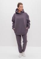 Женский костюм оверсайз из однотонного хлопкового футера с начёсом. Особенностью джемпера является расширенная линия плеча и спущенные длинные рукава на манжетах митенках с отверстием для большого пальца руки. Эта разновидность перчаток, позволяющая оставить свободными пальцы. Боковые швы джемпера за счёт особенности кроя спинки переда смещены вперёд. В них расположены подрезные карманы. Горловина джемпера круглая, обработана двухслойным объёмным капюшоном. Брюки прямые, зауженные к низу, длинные, с карманами. По верхним срезам брюк широкий пояс резинка, в который продёрнут шнур для регулировки объёма пояса по талии. В низ брюк вставлена эластичная тесьма шириной 2 см.