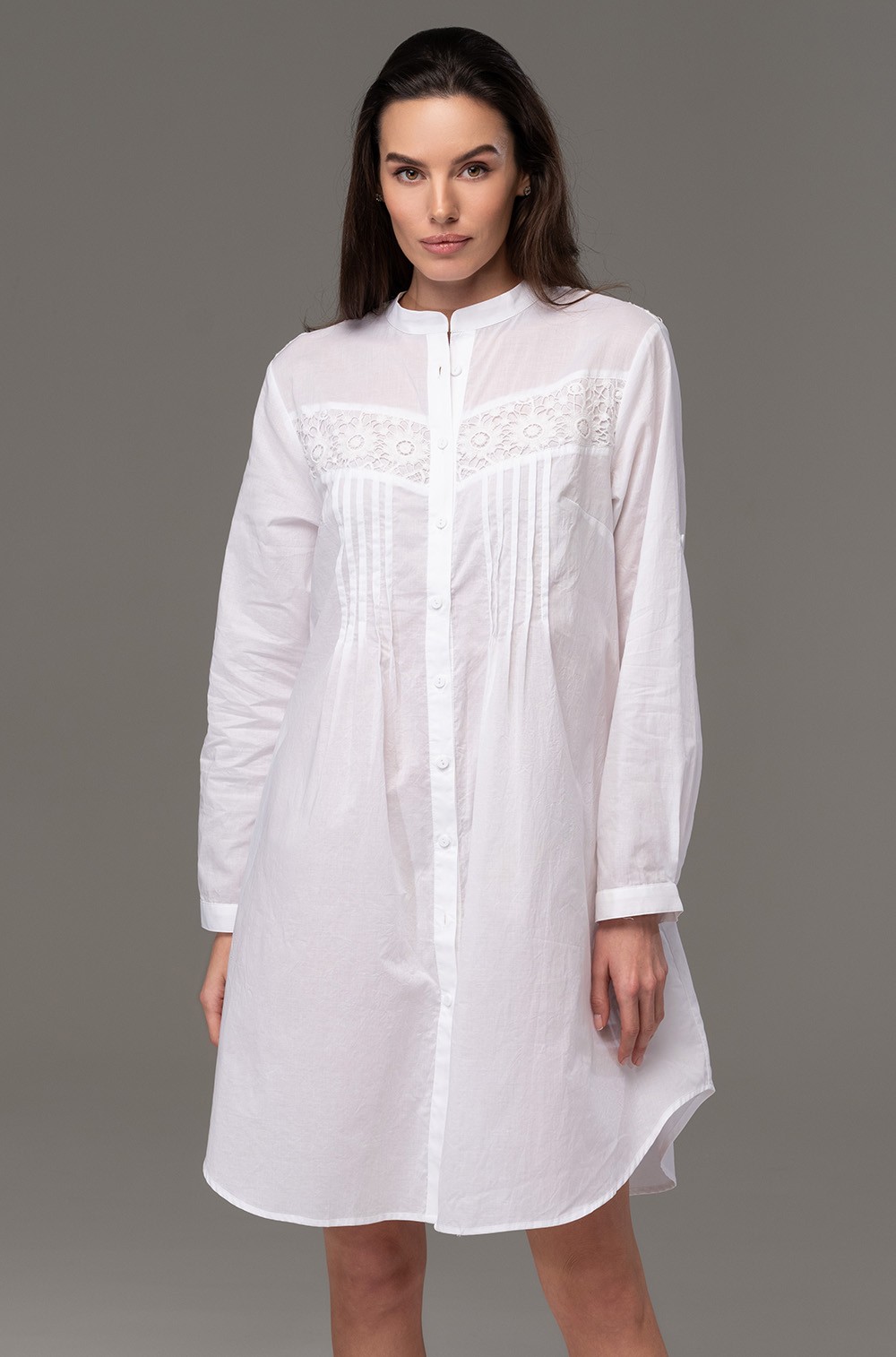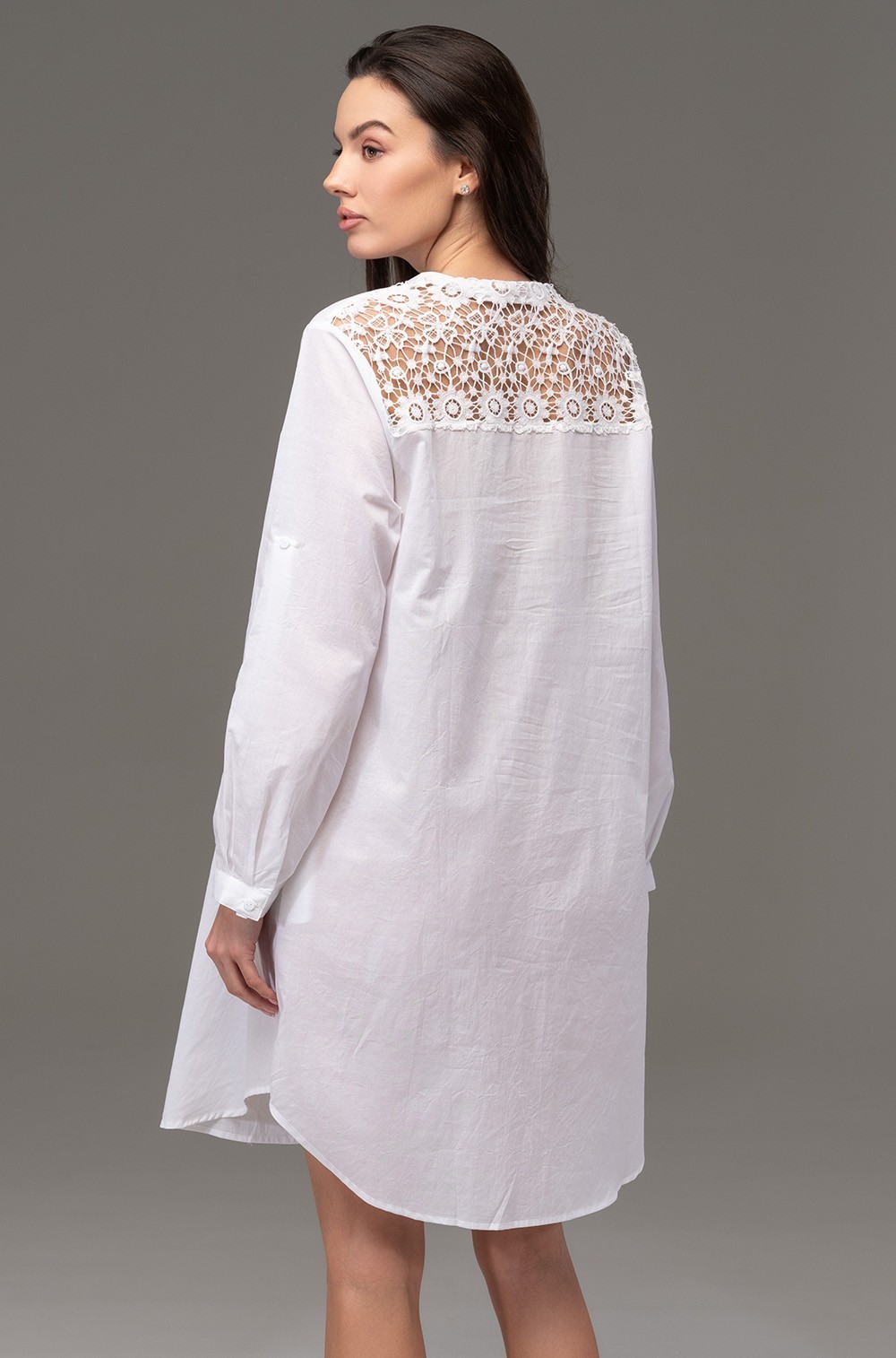 Натуральное хлопковое полотно премиального качества обеспечивает непревзойденный комфорт при носке. Центральная застежка на пуговицы добавляет изделию практичность и позволяет регулировать глубину выреза по вашему желанию. Деликатное кружево и изящные защипы на полочке и кокетке спинки придают модели особый шарм и женственность. Этот элемент декора делает тунику идеальным выбором как для домашнего отдыха, так и для вечерних посиделок с близкими.