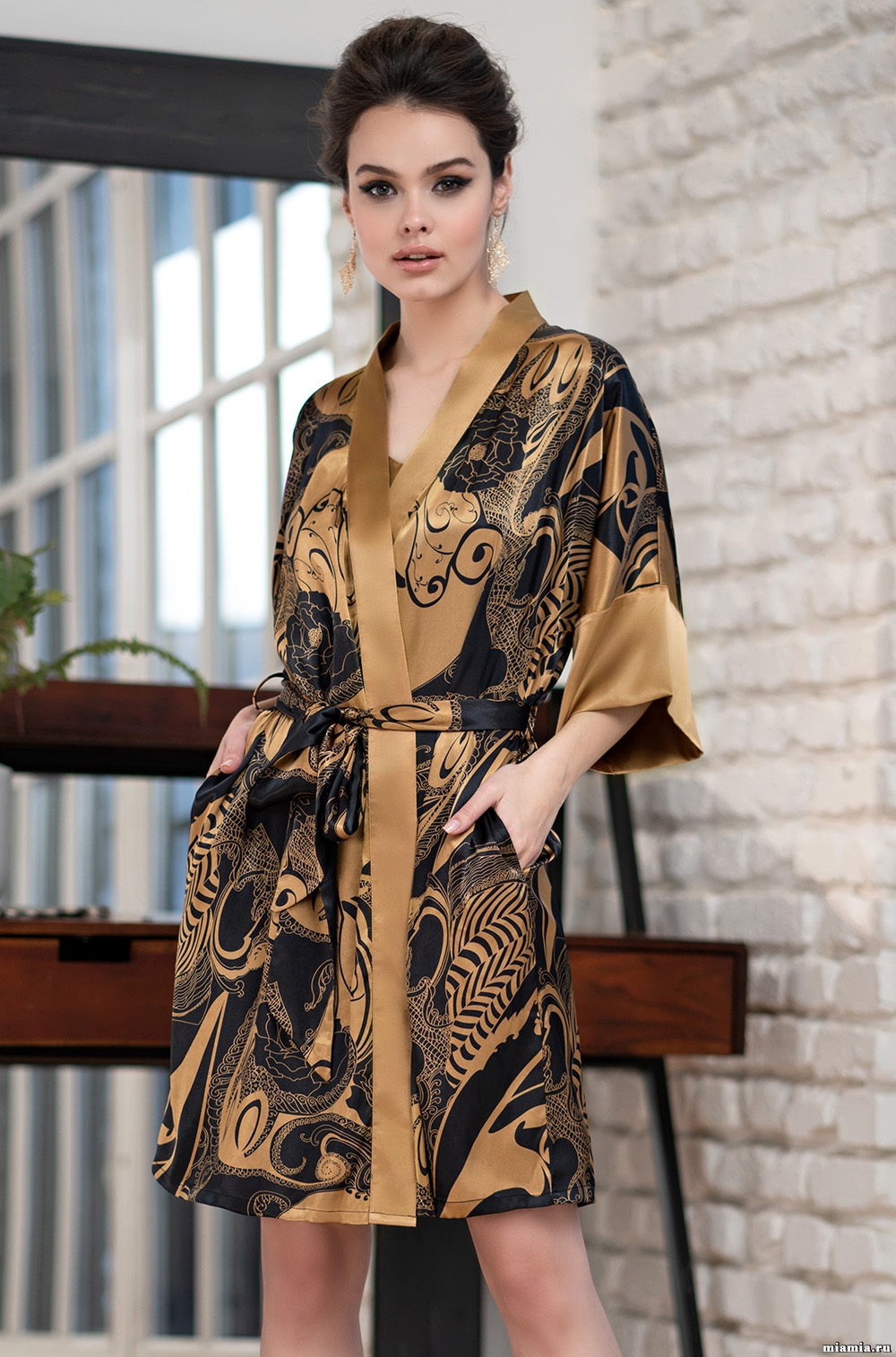 В принте сочетаются геометрические и цветочные мотивы. Атласная отделка медного цвета украшает халаты, сорочки и туники коллекции.