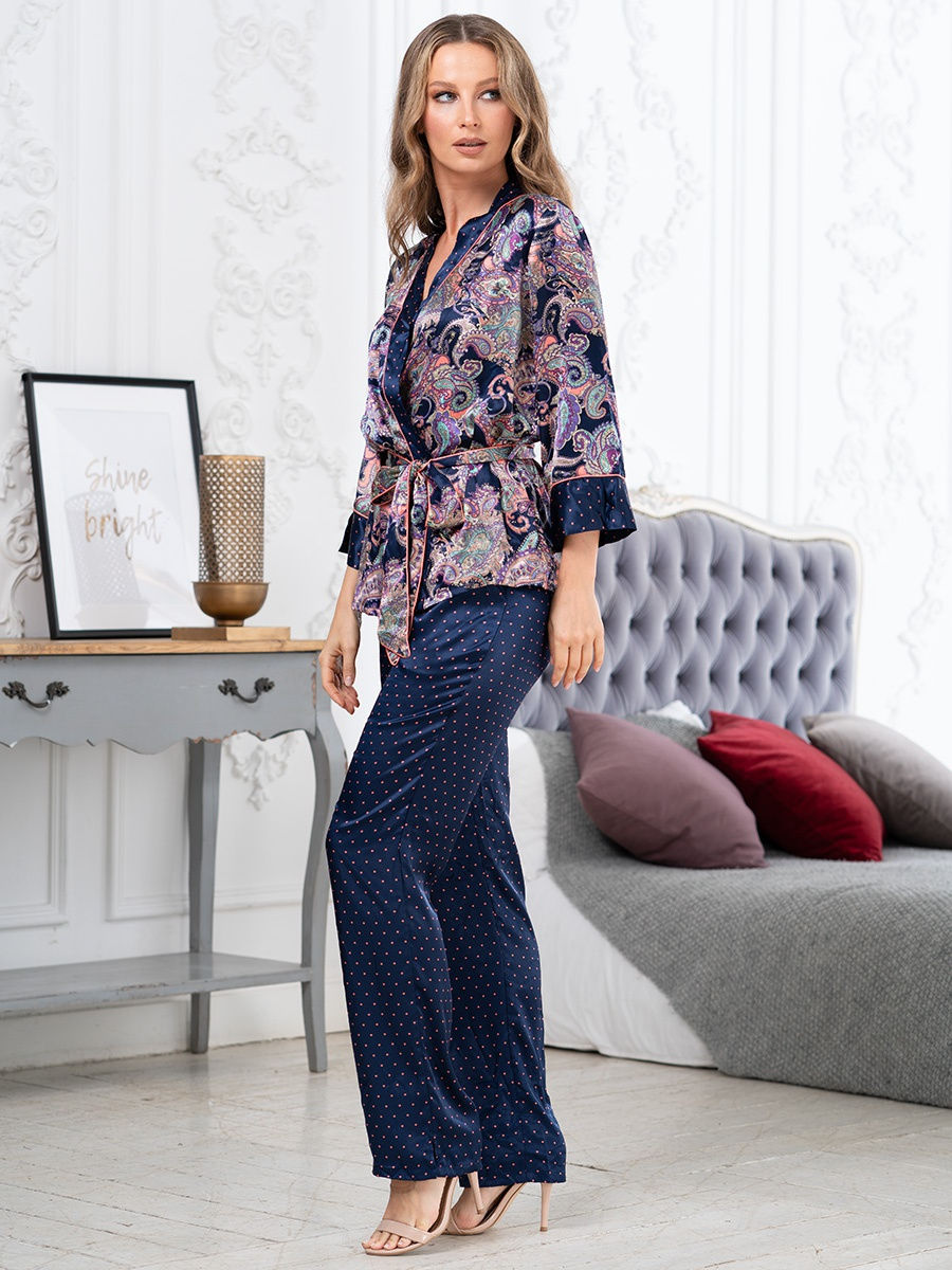 Сложный многоцветный орнамент на гладком блестящем шелке комбинируется с геометрическим принтом в виде мелкого горошка, который напоминает звездное небо, а контрастный кант объединяет эти два стилистически разных принта. Женственность и игривость, загадка и непосредственность соединились в данной коллекции, такая же противоречивая как и любая женская натура.