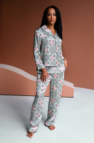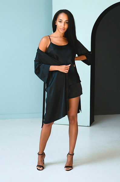 Новые чарующие коллекции из 100% натурального шёлка - Vanda Ванда- серия, ставшая хитом осенней выставки Lingerie Show-Forum 2021, включает в себя восемь моделей: короткие платья, комплекты из топа и шорт, кимоно и комплекты из жакета и брюк. Изделия представлены в классическом глубоком черном цвете, а так же в эффектном фантазийном принте "турецкий огурец". Размерный ряд от XS до XL.