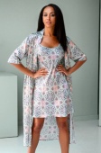 Коллекция представлена семью стильными и элегантными классическими моделями, выполненными в фантазийном принте на нежном мятном фоне: короткие платья полуприлегающего силуэта, комплект из топа и шорт, короткое и длинное кимоно, а так же пижамный комплект из жакета и брюк.